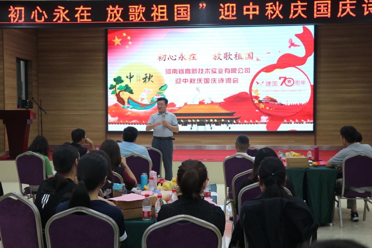 為(wèi)進一(yī)步弘揚愛(ài)國(guó)情懷和(h↔é)中華民(mín)族傳統文(wén)化(huà),9月(yuè)11日(rì)下(xià)午,高(gāo)新公司工(gōng>)會(huì)舉辦“初心永在、放(fàng)歌(gē)祖國(guó)”迎中秋慶國(guó)慶詩詞會(huì)。高(gāo)新公司全體(tǐ)職工(gōγng)參加活動。活動正式開(kāi)始之前,高(gāo)新公司董事(shì)長(cháng)、總經理(lǐ)高(gāo)正龍進行(xíng)了(l™e)精彩緻辭。高(gāo)總在緻辭中強調,要(yào)感恩科(kē)學院、感恩國(guó)家(jiā)、感恩大(dà)時(s>hí)代,并勉勵全體(tǐ)職工(gōng)充分(fēn)發揮高(gāo)新公司自(zì)身(shēn)優勢,再接再厲,共創佳績。最後,高(∑gāo)總向大(dà)家(jiā)緻以節日(rì)的(de)美(měi)好(hǎo)祝福。