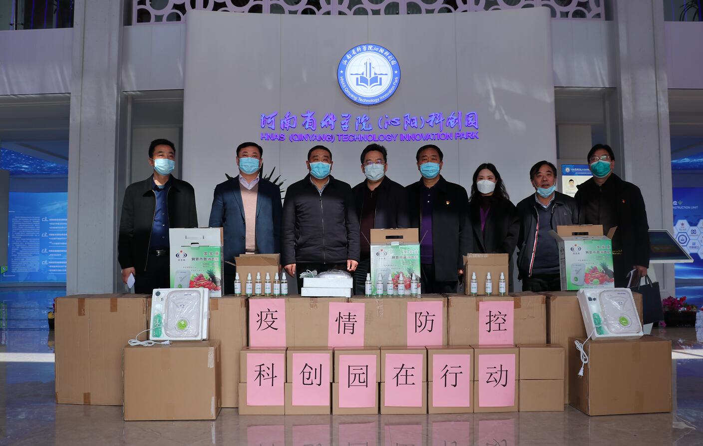 河(hé)南(nán)省科(kē)學院沁陽科(kē)創園向沁陽市(sh&ì)人(rén)民(mín)政府捐贈自(zì)主研發臭氧消毒殺菌機(jī)60台,納米銀(yín)植物(wù)手消液500瓶,總價值伍萬叁仟元整,用(yòng)科(kē)研行(xíng)動為(wèi)沁陽市(shì)防控防疫工(gōng)作(zuò)積極貢獻力量。