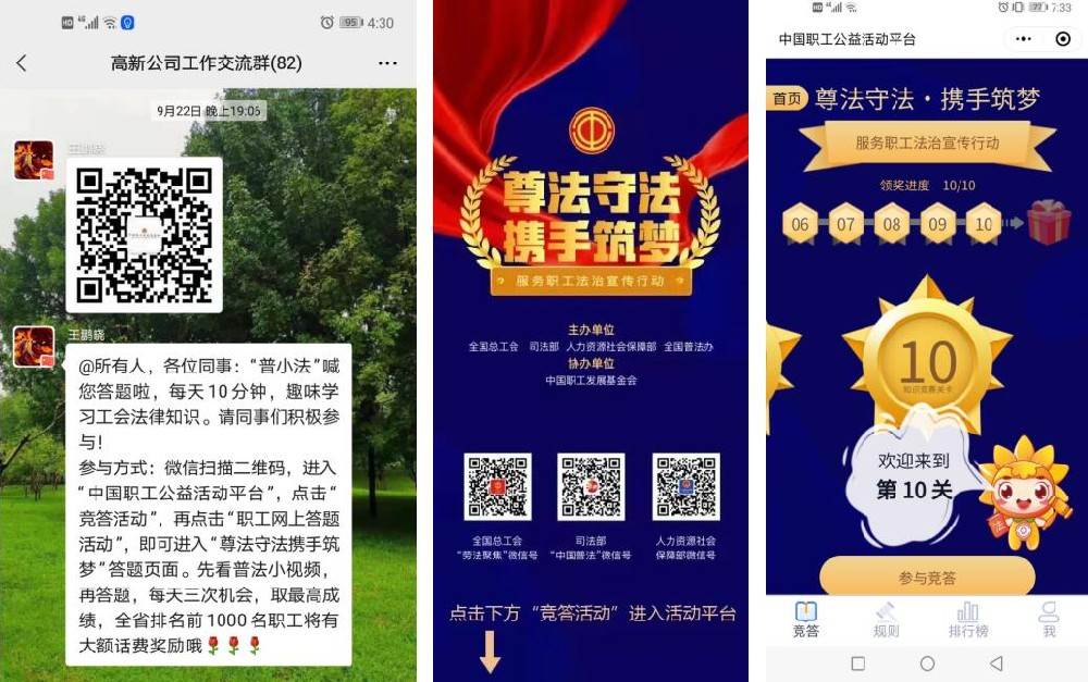為(wèi)深入學習(xí)宣傳貫徹落實習(xí)近(jìn)平法治思想,主動适應我國(guó)進入新發展α階段、貫徹新發展理(lǐ)念、構建新發展格局的(de)需要(yào),紮實推進意識形态工(gōng)作(zuò),努力營造尊法學法守法用(yòng)法的(de)良好(hǎo)氛圍,高(gāo)新公司組織職工(gōng)于2021年(nián)9月(yuè)18日(rì)-9月(yuè)27日(rì)參與由全國♦(guó)總工(gōng)會(huì)、司法部、人(rén)力資源社會(huì)保障部、全國(guó)普法辦聯合開(kāi)展的(≠de)“尊法守法 攜手築夢”服務職工(gōng)法治宣傳行(xíng)動網上(shàng)競答(dá)₹活動。